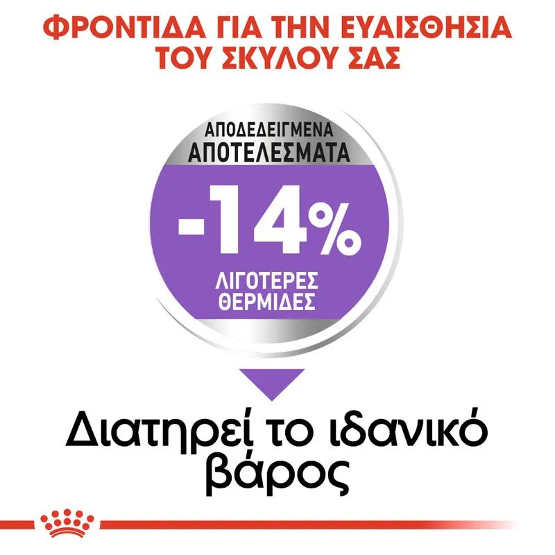 Η σύνθεση είναι έως 14% χαμηλότερη σε θερμίδες σε σχέση με μια τυπική τροφή συντήρησης, συμβάλλοντας αποτελεσματικά στον έλεγχο του βάρους μετά τη στείρωση, ενώ η προσθήκη L-καρνιτίνης βοηθά στη μετατροπή του λίπους σε ενέργεια.