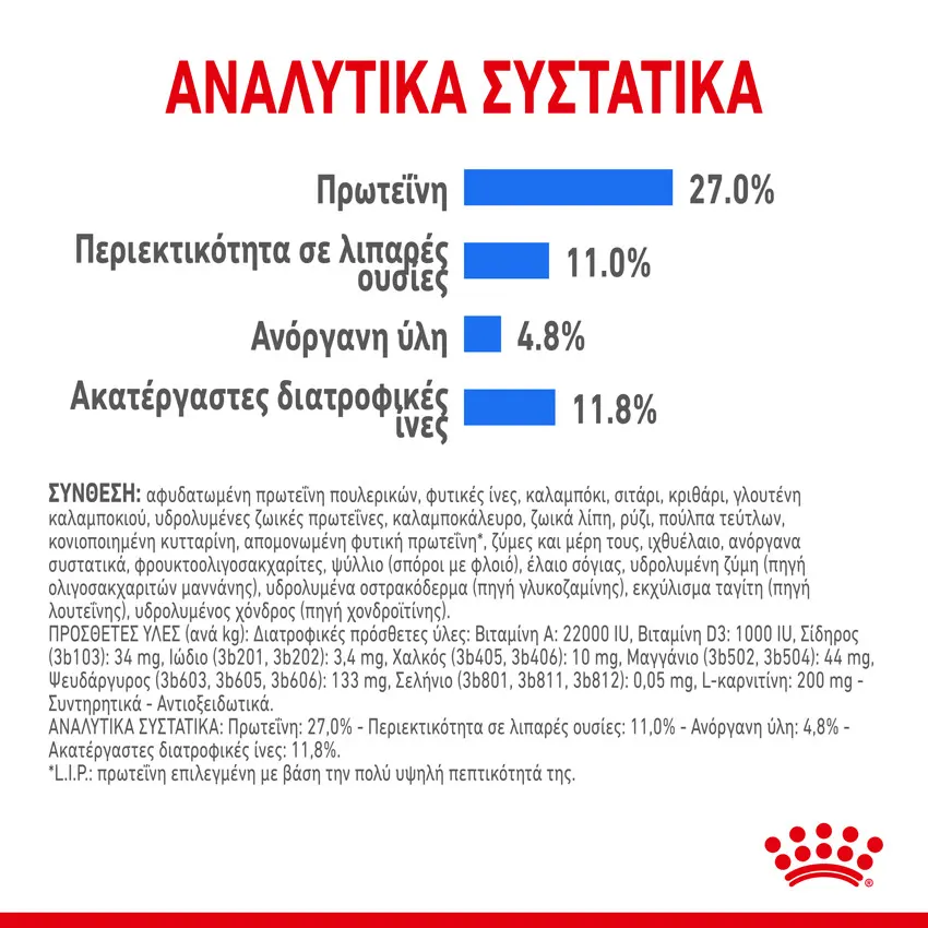 - Διαχείριση βάρους: Υψηλή πρωτεΐνη (27%) και χαμηλά λιπαρά (11%)